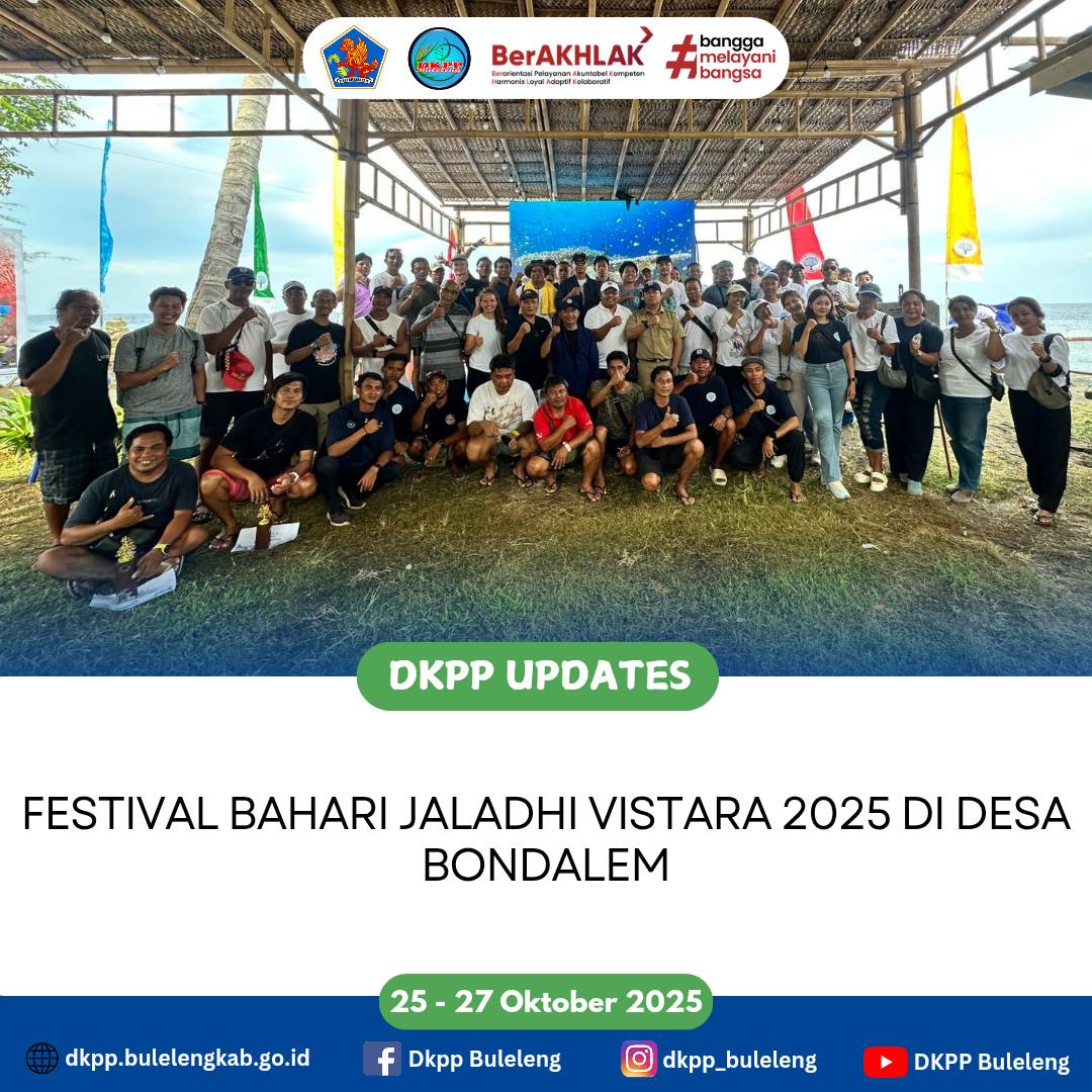 Dinas Ketahanan Pangan dan Perikanan (DKPP) Kabupaten Buleleng mengikuti serangkaian acara Festival Bahari “JALADHI VISTARA 2025” berlokasi di Desa Bondalem, Kecamatan Tejakula yang berlangsung pada 25 - 27 Oktober 2025. Kegiatan ini sukses menarik perhatian berbagai kalangan, mulai dari instansi pemerintah, akademisi, komunitas kelautan, hingga masyarakat pesisir. Festival kali ini mengusung tema “Our Ocean, Our Obligation, Our Opportunity,” festival ini menjadi momentum penting dalam meningkatkan kesadaran masyarakat akan pentingnya pelestarian ekosistem laut sekaligus membuka ruang kolaborasi dalam pengembangan potensi bahari daerah.