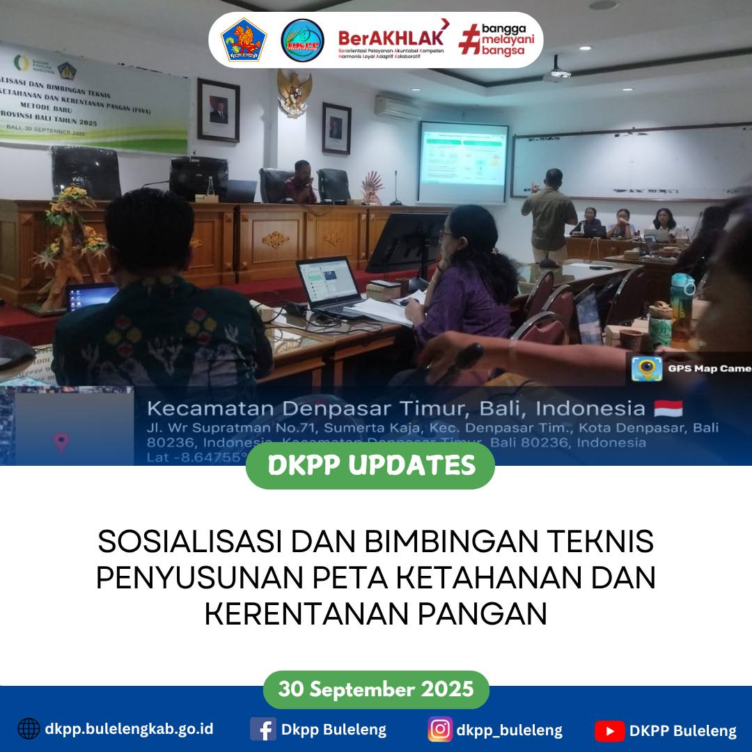 Selasa, 30 September 2025 - Dinas Ketahanan Pangan dan Perikanan (DKPP) Kabupaten Buleleng menghadiri sosialisasi dan bimbingan teknis penyusunan Peta Ketahanan dan Kerentanan Pangan / Food Security and Vulnerability Atlas (FSVA) menggunakan Metode Baru yang diselenggarakan Dinas Pertanian dan Ketahanan Pangan Provinsi Bali dengan menghadirkan fasilitator dari Badan Pangan Nasional, serta dihadiri oleh 9 instansi Kabupaten/Kota se-Bali.