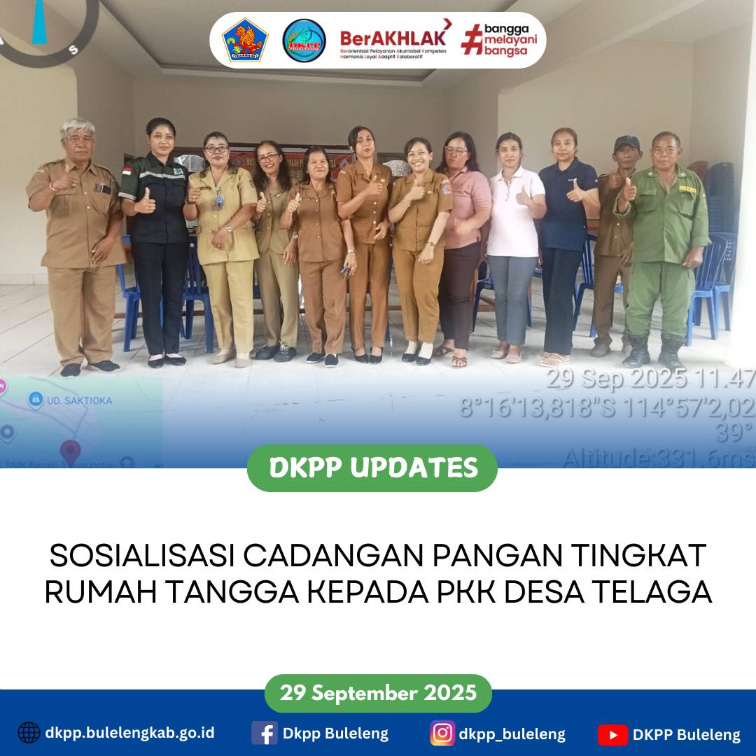 Senin, 29 September 2025 - Dinas Ketahanan Pangan dan Perikanan (DKPP) Kabupaten Buleleng melalui Bidang Distribusi dan Cadangan Pangan melaksanakan Sosialisasi Cadangan Pangan Tingkat Rumah Tangga kepada PKK Desa Telaga, Kecamatan Busungbiu. Kegiatan dihadiri Analis Ketahanan Pangan DKPP Buleleng (Nyoman Sukerni, S.H., M.Pd) bersama staf, dan didampingi staf Kantor Desa Telaga.
