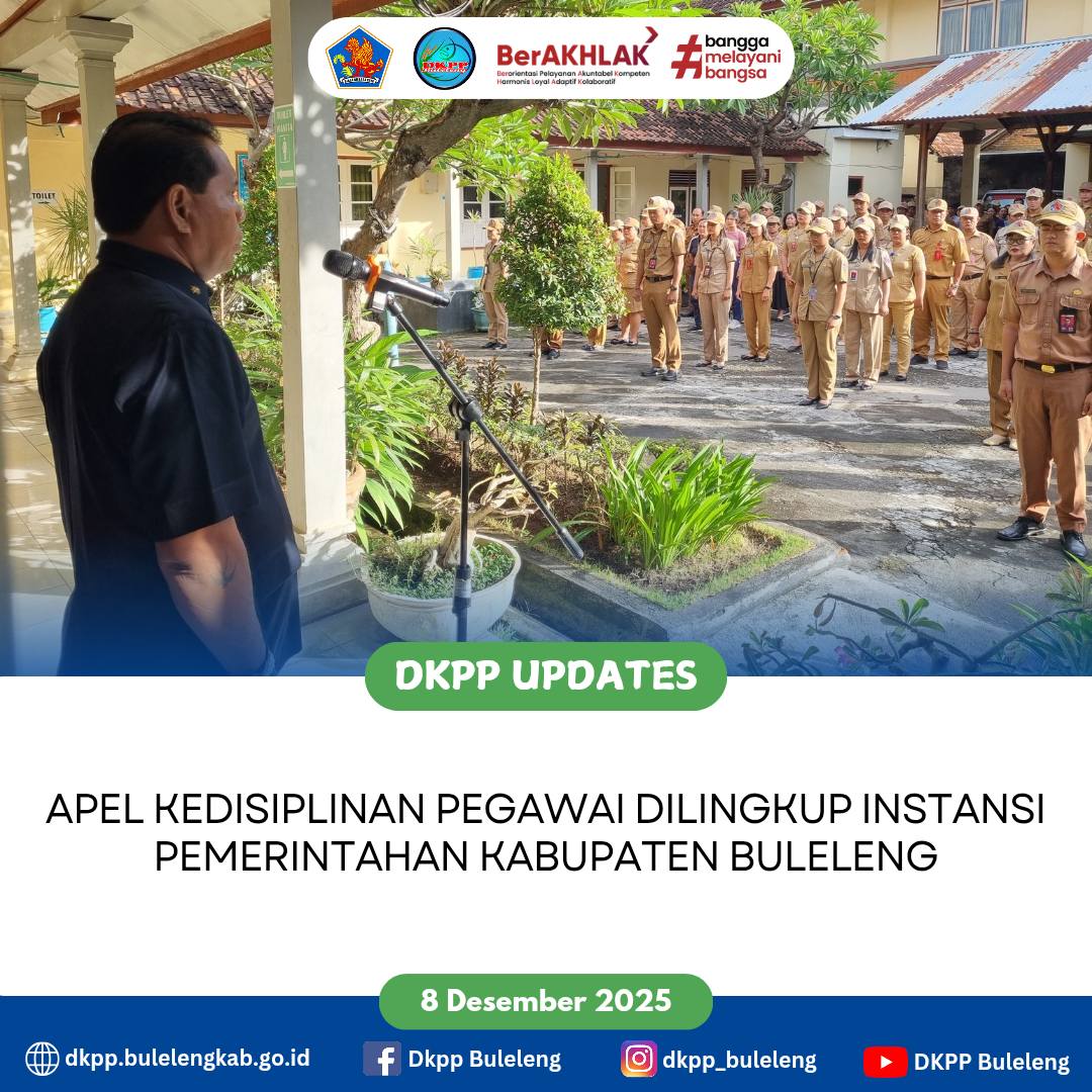 Apel Disiplin Dinas Ketahanan Pangan dan Perikanan (DKPP) Kabupaten Buleleng dalam rangka menjaga sikap kedisplinan di lingkungan Instansi Pemerintahan yang dipimpin Plt. Kepala Dinas (Gede Melandrat, SP.) dan diikuti peserta apel yang terdiri dari jajaran Pejabat Struktural, Pejabat Fungsional/Sub Koordinator, serta para staf bidang dan sekretariat. Senin (8/12)