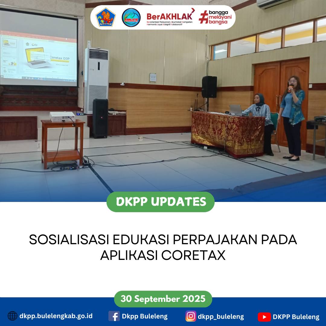 Selasa, 30 September 2025 - Dinas Ketahanan Pangan dan Perikanan (DKPP) Kabupaten Buleleng mengikuti Sosialisasi Edukasi Perpajakan Pada Aplikasi Coretax, pembuatan akun Coretax dan cara pelaporan SPT Tahunan Pribadi. Kendala pembuatan akun cortex yang no HP dan Email tidak muncul bisa langsung ke Kantor Pelayanan Pajak Pratama Singaraja mengingat data tersebut belum dipadankan. Kemudian harus dilakukan pengisian pada kolom Harta untuk Surat Pemberitahuan (SPT) Tahunan.
