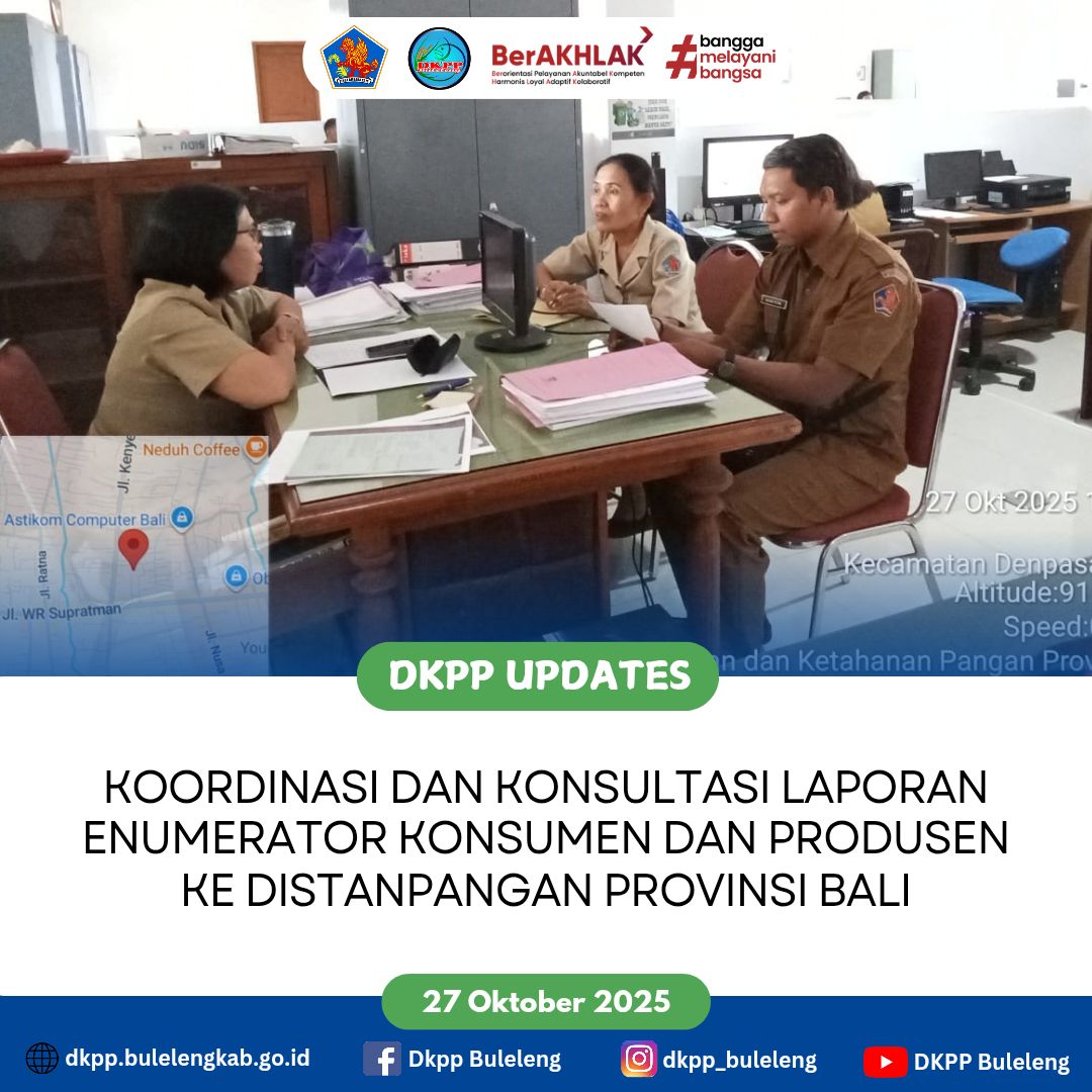 Senin, 27 Oktober 2025 - Dinas Ketahanan Pangan dan Perikanan (DKPP) Kabupaten Buleleng melalui Bidang Distribusi dan Cadangan Pangan melaksanakan Koordinasi dan Konsultasi perihal Laporan Enumerator Konsumen dan Produsen ke Dinas Pertanian dan Ketahanan Pangan Provinsi Bali.