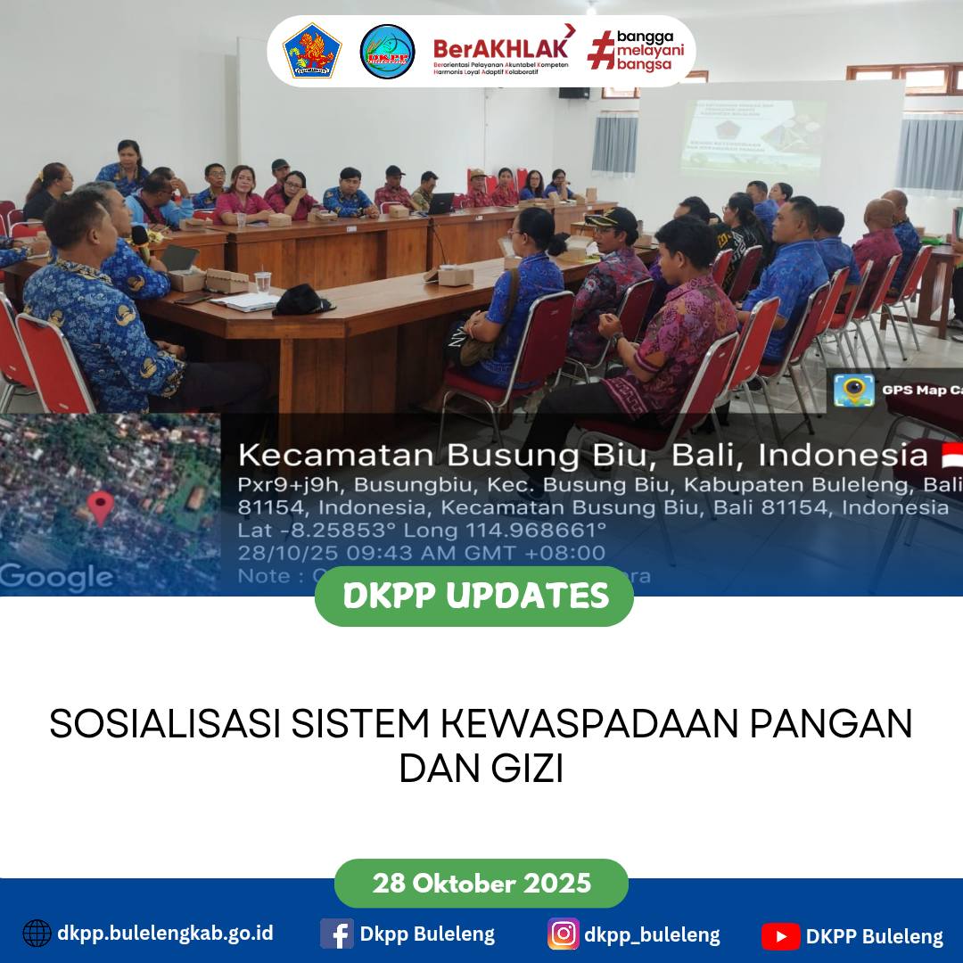 Selasa, 28 Oktober 2025 - Dinas Ketahanan Pangan dan Perikanan (DKPP) Kabupaten Buleleng melalui Bidang Ketersediaan dan Kerawanan Pangan melaksanakan Sosialisasi Sistem Kewaspadaan Pangan dan Gizi bertempat di Kantor Camat Busungbiu dengan melibatkan peserta dari masing-masing desa. Sosialisasi ini dimaksudkan untuk memberikan pemahaman berkaitan dengan situasi kerawanan pangan pada setiap bulan dan langkah intervensi yang bisa dilakukan.