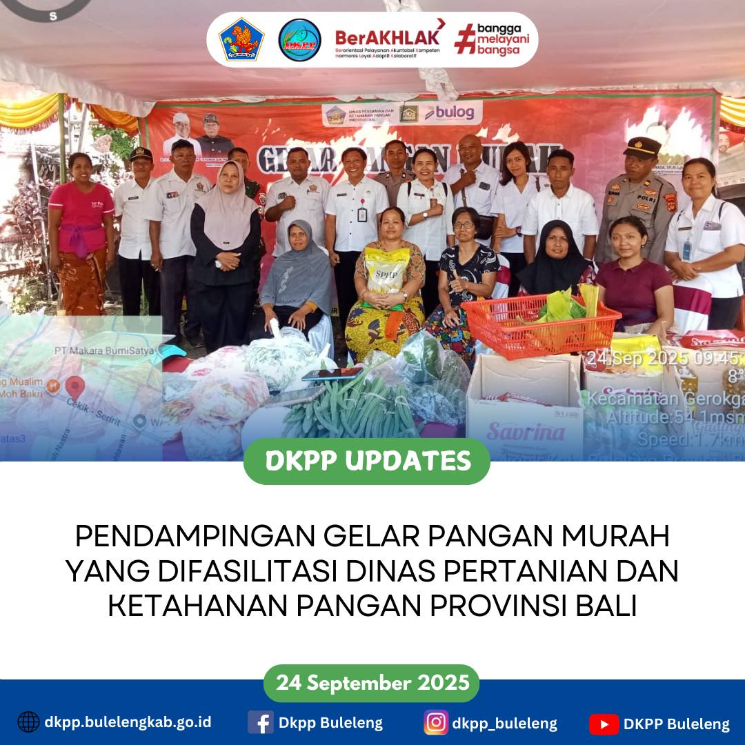 Rabu, 24 September 2025- Dinas Ketahanan Pangan dan Perikanan Kabupaten Buleleng melaksanakan kegiatan pendampingan Gelar Pangan Murah yang difasilitasi oleh Dinas Pertanian dan Ketahanan Pangan Provinsi Bali.