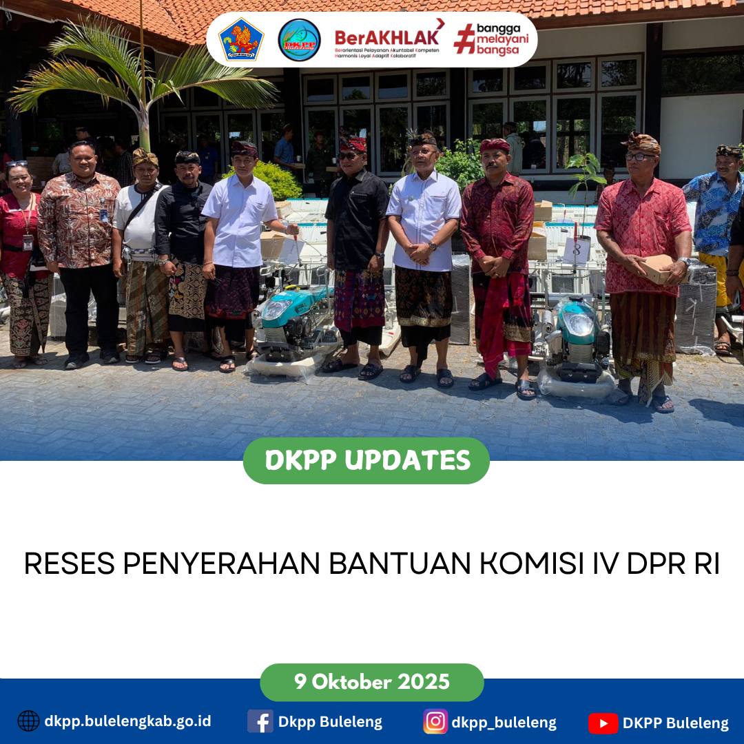 Kamis, 9 Oktober 2025 - Kepala Dinas Ketahanan Pangan dan Perikanan Kabupaten Buleleng I Gede Putra Aryana, S.Sos., MAP. menghadiri Reses Penyerahan Bantuan Komisi IV DPR RI bertempat di Gedung Wanita Laksmi Graha. Bantuan yang diberikan berupa bibit tanaman dan alat pertanian.