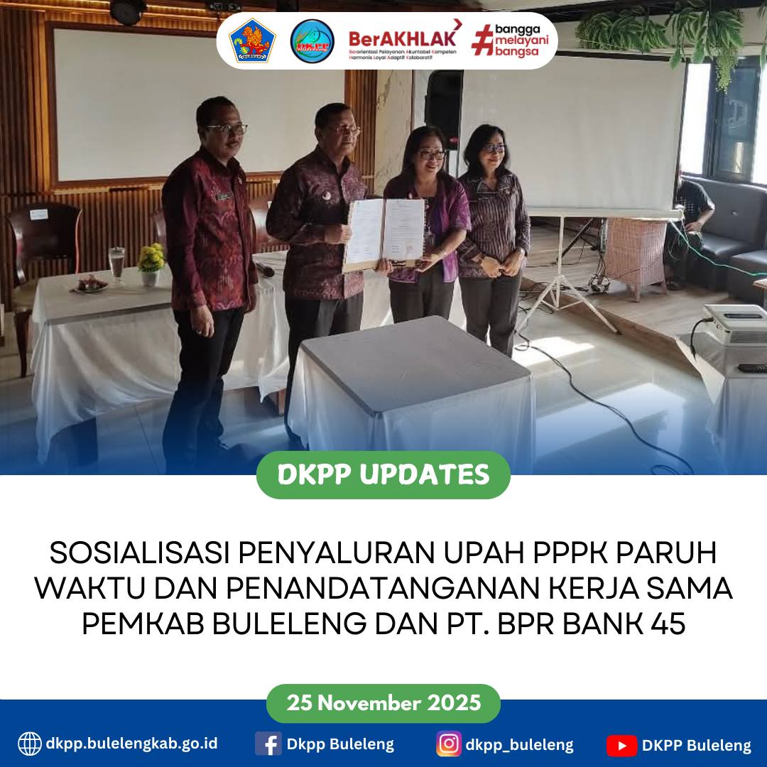 Selasa, 25 November 2025 - Dinas Ketahanan Pangan dan Perikanan (DKPP) Kabupaten Buleleng menghadiri sosialisasi penyaluran upah Pegawai Pemerintah dengan Perjanjian Kerja (PPPK) Paruh Waktu, sekaligus penandatanganan Kesepakatan Bersama dan Perjanjian Kerja Sama antara Pemerintah Kabupaten Buleleng dan PT. BPR Bank 45 (Perseroda) bertempat di B’dlodd Resto, Penarukan. Kegiatan ini dihadiri Bupati Buleleng dr. I Nyoman Sutjidra, Sp.OG. didampingi Sekda Buleleng, serta turut hadir Kepala Perangkat Daerah bersama bendahara pengeluaran SKPD.