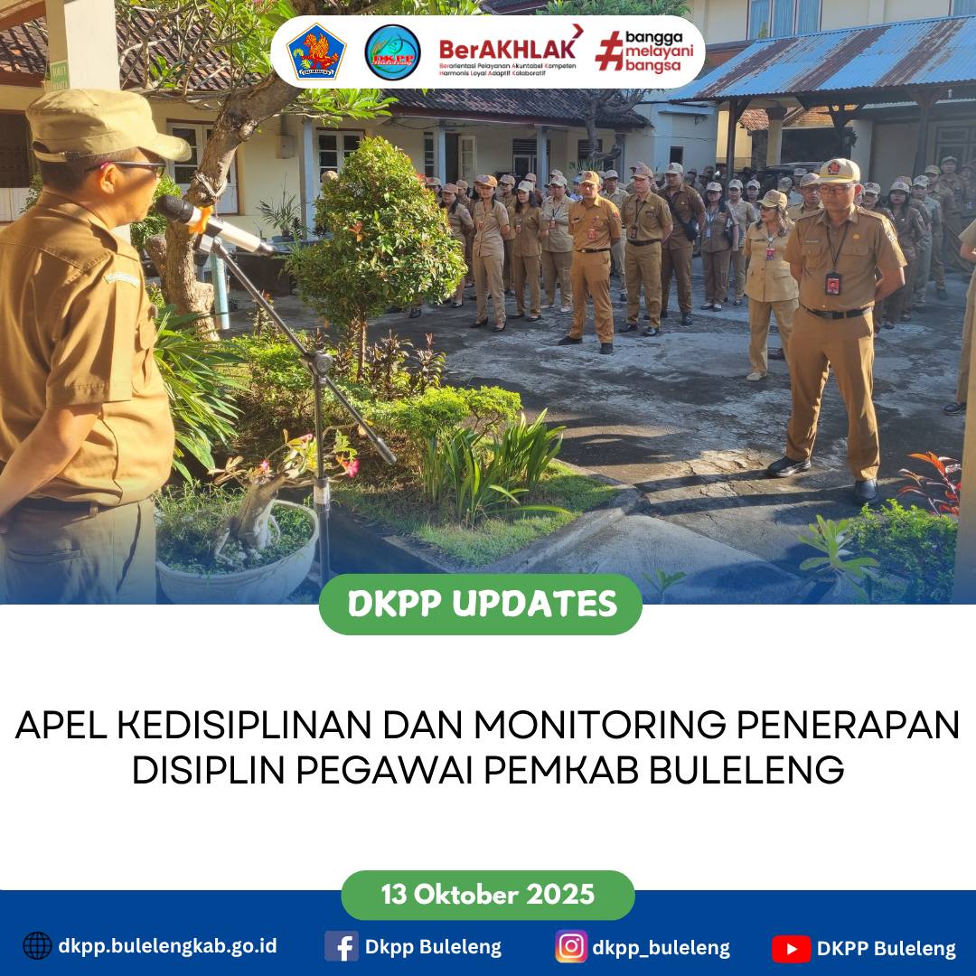 Senin, 13 Oktober 2025 - Apel Pagi Dinas Ketahanan Pangan dan Perikanan (DKPP) Kabupaten Buleleng dalam rangka menjaga sikap kedisplinan di lingkungan Instansi Pemerintahan yang dipimpin Kepala Dinas I Gede Putra Aryana, S.Sos., MAP. dan diikuti seluruh jajaran. Pada kesempatan ini, Kadis DKPP Buleleng menekankan terkait kedisiplinan pegawai, seperti kehadiran dalam apel rutin dan absensi, selanjutnya seluruh jajaran dihimbau agar melaksanakan seluruh agenda dinas dengan baik.