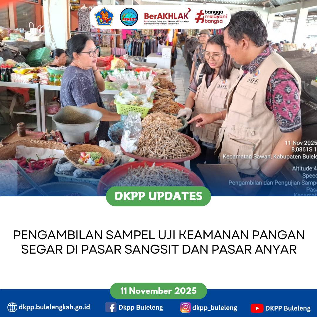 Selasa, 11 November 2025 - Dinas Ketahanan Pangan dan Perikanan (DKPP) Kabupaten Buleleng melalui Bidang Penganekaragaman Konsumsi dan Keamanan Pangan melakukan pengambilan bahan sampel untuk dilakukan uji keamanan pangan segar pada dua Pasar yaitu Pasar Sangsit, Kecamatan Sawan dan Pasar Umum Anyar, Kecamatan Buleleng.