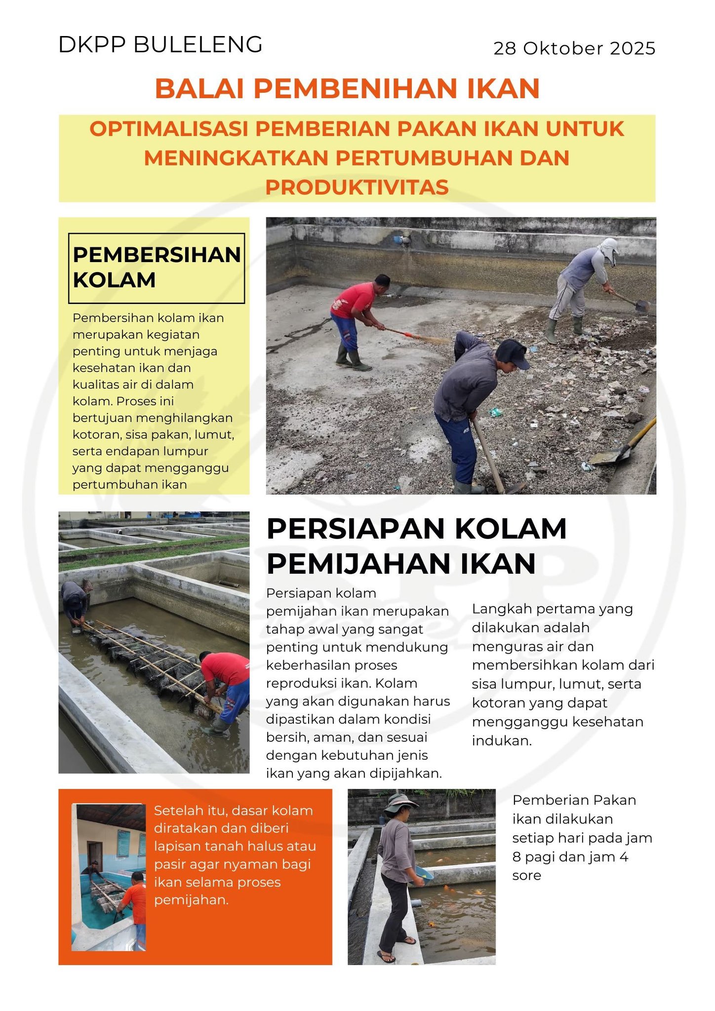 Selasa, 28 Oktober 2025 - Optimalisasi Pemberian Pakan Ikan untuk meningkatkan pertumbuhan dan produktivitas pada UPTD Balai Perbenihan Ikan (BPI) Kabupaten Buleleng.