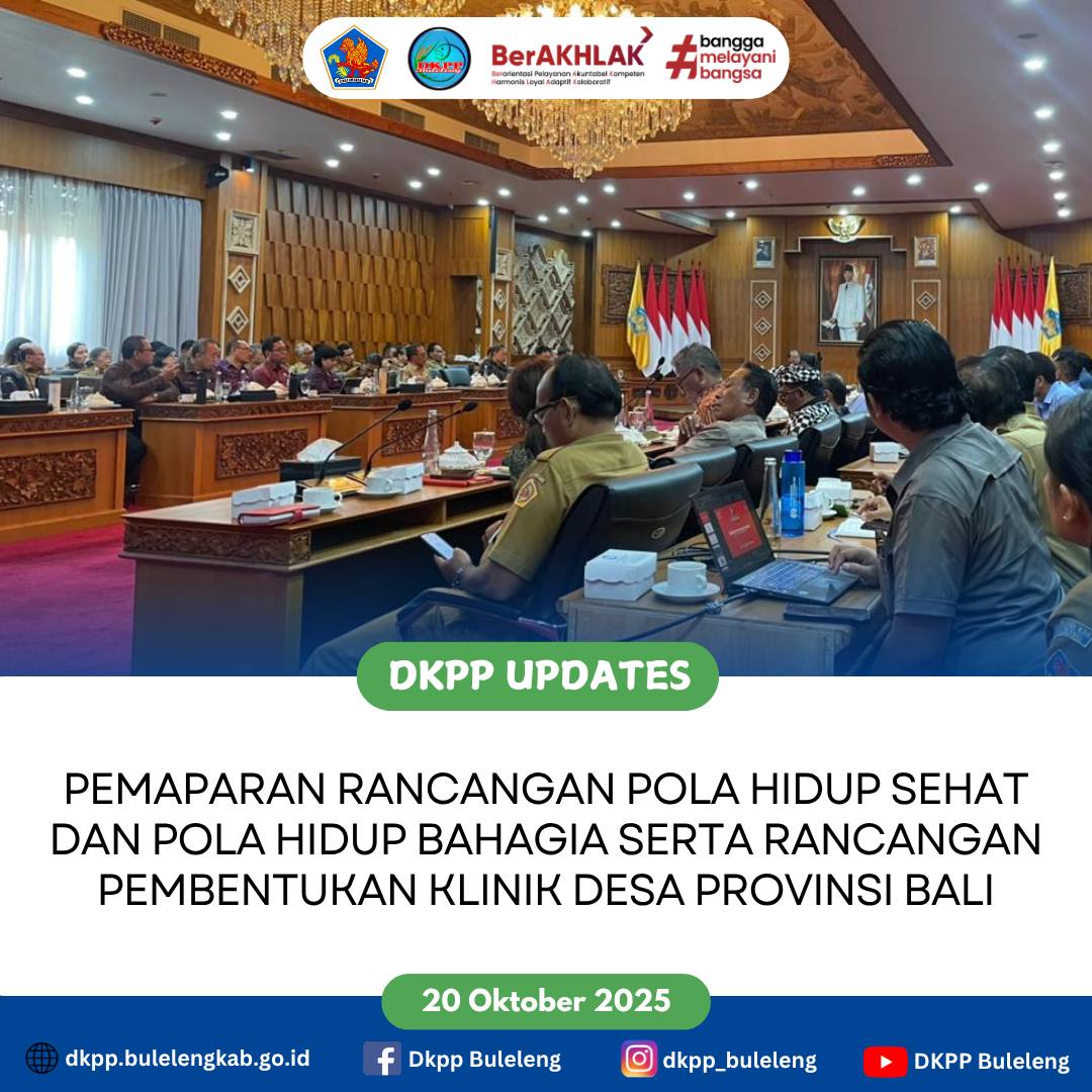 Sekretaris Dinas Ketahanan Pangan dan Perikanan Kabupaten Buleleng Ariston Adhi Pamungkas, S.P., M. Env Man. menghadiri Pemaparan Rancangan Pola Hidup Sehat dan Pola Hidup Bahagia, serta Rancangan Pembentukan Klinik Desa yang merupakan Program Super Prioritas Mendesak Pemerintah Provinsi Bali. Pertemuan berlangsung di Gedung Kertha Sabha, Kompleks Rumah Jabatan Gubernur Bali, dipimpin langsung oleh Gubernur Bali I Wayan Koster besama dengan para narasumber terkait. Hadir pada kesempatan ini, Perangkat Daerah Pemprov Bali dan Pemkab/Pemkot se-Bali yang terkait dengan Kebudayaan, Sosial, Pertanian, Ketahanan Pangan dan Perikanan, Tenaga Kerja, dan PTSP. (20/10)
