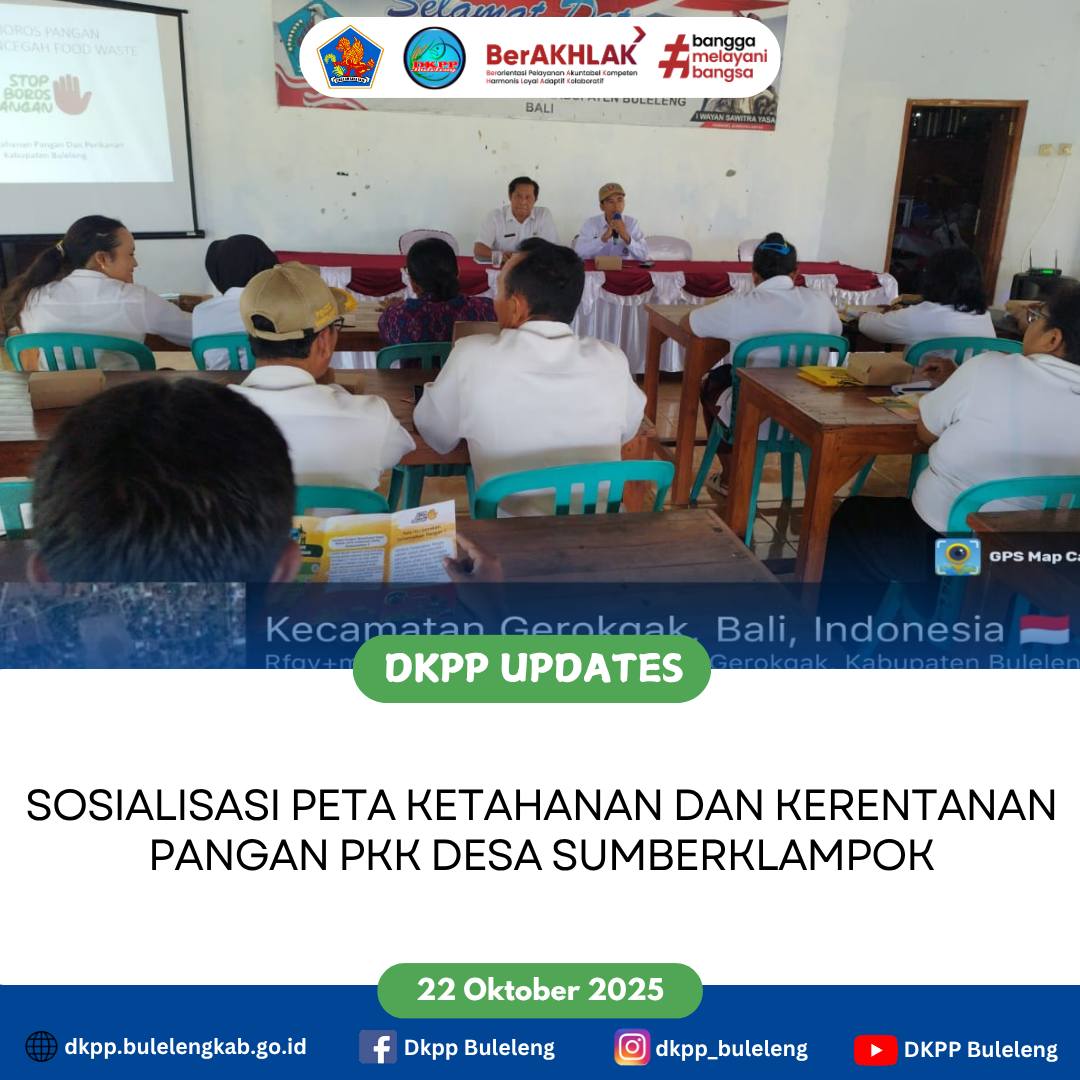Rabu, 22 Oktober 2025 - Dinas Ketahanan Pangan dan Perikanan (DKPP) Kabupaten Buleleng melalui Bidang Ketersediaan dan Kerawanan Pangan menggelar Sosialisasi Peta Ketahanan dan Kerentanan Pangan / Food Security and Vulnerability Atlas (FSVA) dengan melibatkan unsur Desa dan PKK di Desa Sumberklampok, Kecamatan Gerokgak. Rapat Sosialisasi dibuka oleh Perbekel Desa Sumberklampok dan dilanjutkan dengan penyampaian materi mengenai Gerakan Stop Boros Pangan.