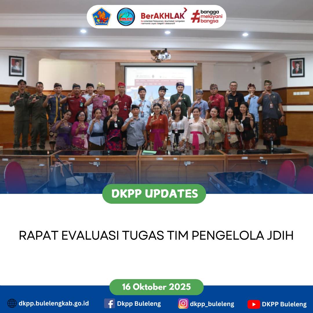 Dinas Ketahanan Pangan dan Perikanan (DKPP) Kabupaten Buleleng mengikuti Rapat Evaluasi Tugas Tim Pengelola JDIH bertempat di Gedung Unit IV Kantor Bupati Buleleng, dalam rangka identifikasi Produk Hukum Daerah yang ada di masing-masing Perangkat Daerah. (16/10)