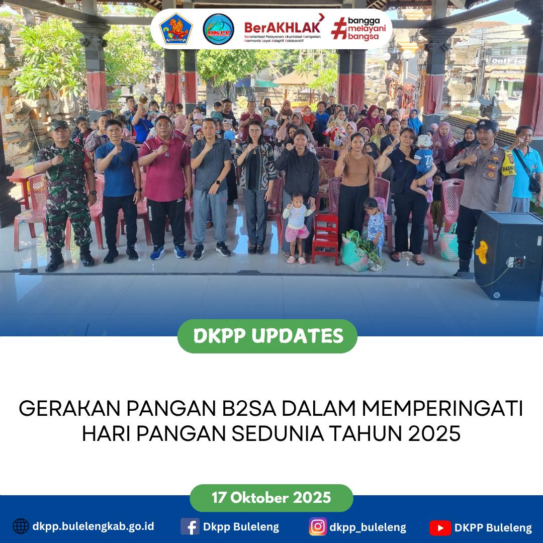 Jumat, 17 Oktober 2025 - Bertempat di Wantilan Desa Adat Seririt, Dinas Ketahanan Pangan dan Perikanan (DKPP) Kabupaten Buleleng menggelar Gerakan Pangan B2SA (Beragam, Bergizi, Seimbang, dan Aman) dalam rangka Peringatan Hari Pangan Sedunia Tahun 2025 yang mengusung tema "Hand in Hand for Better Foods and a Better Future". Dalam kegiatan dilakukan pemberian paket pangan B2SA kepada keluarga penerima di wilayah Kelurahan Seririt, berdasarkan data keluarga beresiko stunting.