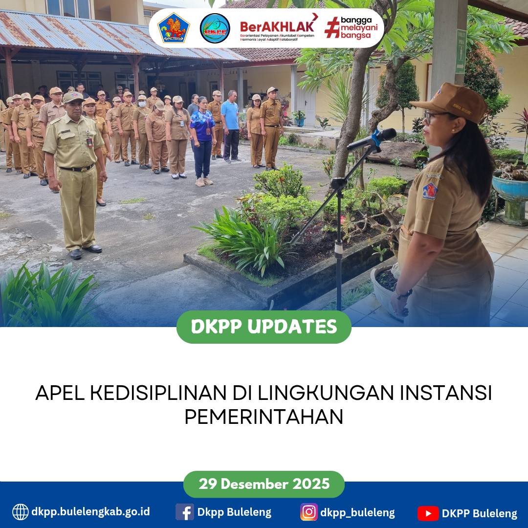 Apel Disiplin Dinas Ketahanan Pangan dan Perikanan (DKPP) Kabupaten Buleleng dalam rangka menjaga sikap kedisplinan di lingkungan Instansi Pemerintahan yang dipimpin Plt. Kepala Dinas (Gede Melandrat, SP.) dan diikuti peserta apel yang terdiri dari jajaran Pejabat Struktural, Pejabat Fungsional/Sub Koordinator, serta para staf bidang dan sekretariat. Senin (29/12)
