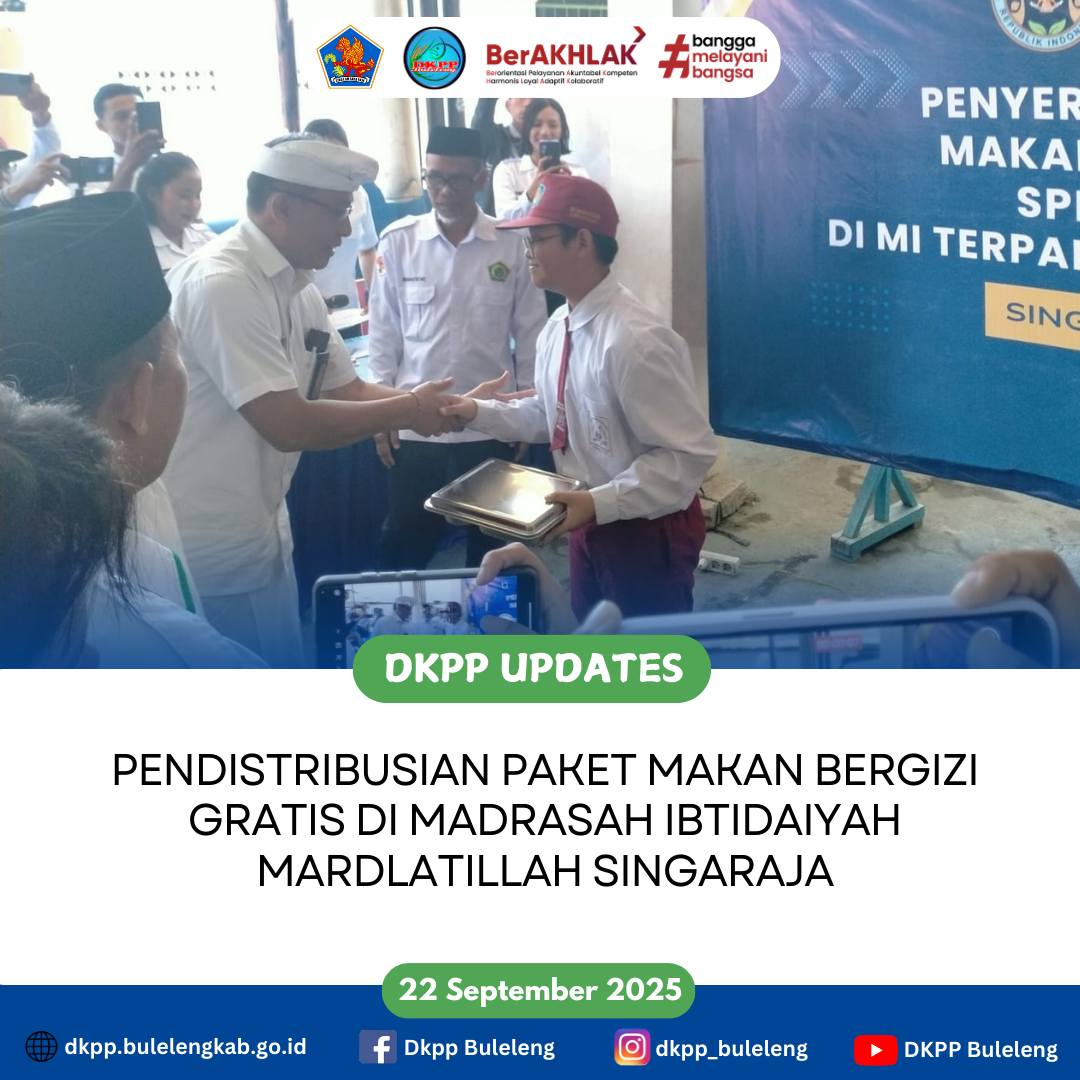 Senin, 22 September 2025 - Dinas Ketahanan Pangan dan Perikanan (DKPP) Kabupaten Buleleng menghadiri Pendistribusian Paket Makan Bergizi Gratis (MBG) bertempat di Madrasah Ibtidaiyah (MI) Mardlatillah, Singaraja yang diinisiasi oleh Badan Gizi Nasional melalui Satuan Pelayanan Pemenuhan Gizi (SPPG). Penyerahan paket MBG secara simbolis dilakukan oleh Plt. Kepala Disdikpora Buleleng kepada perwakilan siswa MI Mardlatillah Singaraja.