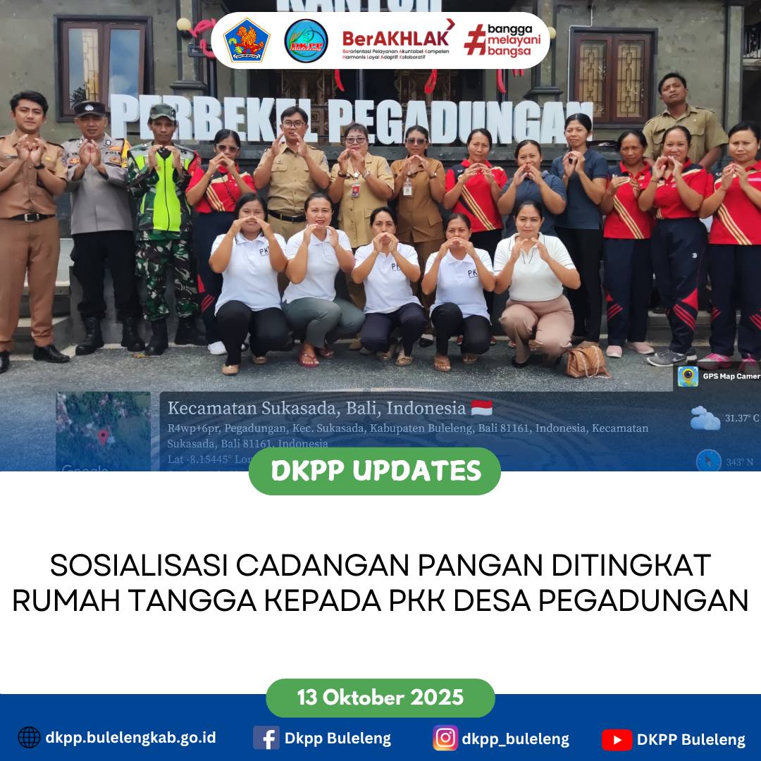Dinas Ketahanan Pangan dan Perikanan (DKPP) Kabupaten Buleleng melalui Bidang Distribusi dan Cadangan Pangan melaksanakan Sosialisasi Cadangan Pangan di Tingkat Rumah Tangga kepada PKK Desa Pegadungan, Kecamatan Sukasada. Kegiatan ini dibuka oleh Sekdes Pegadungan dan dihadiri Analis Ketahanan Pangan DKPP Buleleng bersama staf. (13/10)