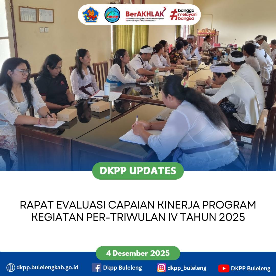 Rapat Evaluasi Capaian Kinerja Program/Kegiatan/Sub Kegiatan Dinas Ketahanan Pangan dan Perikanan (DKPP) Kabupaten Buleleng per-Triwulan IV 2025, bertempat di Ruang Rapat DKPP Buleleng yang dipimpin Plt. Sekdis DKPP Buleleng serta dihadiri Pejabat Struktural, Pejabat Fungsional/Sub Koordinator, serta para staf bidang dan sekretariat. Kamis (4/12)