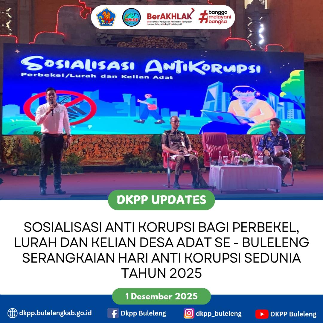 Dinas Ketahanan Pangan dan Perikanan (DKPP) Kabupaten Buleleng menghadiri Sosialisasi Antikorupsi Bagi Perbekel, Lurah dan Kelian Desa Adat se-Kabupaten Buleleng bertempat di Gedung Kesenian Gde Manik, Singaraja dalam serangkaian dengan kegiatan Hari Anti Korupsi Sedunia (HAKORDIA) Tahun 2025, dengan menghadirkan Narasumber Kepala Polres Buleleng dan Kepala Kejaksaan Negeri Singaraja. Senin (1/12)