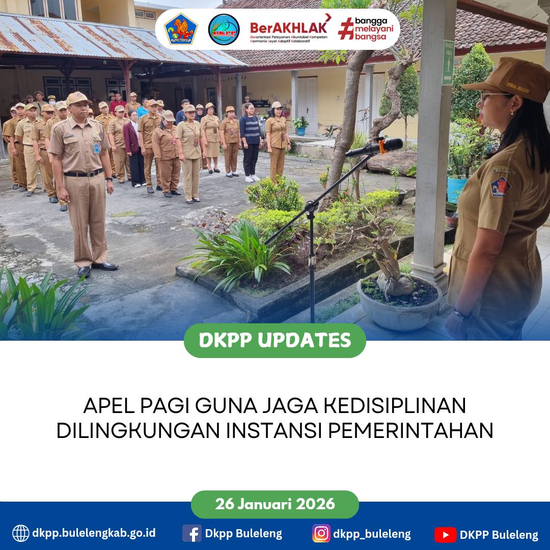 Senin, 26 Januari 2026 - Apel Pagi Dinas Ketahanan Pangan dan Perikanan (DKPP) Kabupaten Buleleng dalam rangka menjaga sikap kedisplinan di lingkungan Instansi Pemerintahan yang dipimpin Plt. Kepala Bidang Penganekaragaman Konsumsi dan Keamanan Pangan dalam hal ini mewakili Kepala Dinas, diikuti peserta apel yang terdiri dari jajaran Pejabat Struktural, Pejabat Fungsional/Sub Koordinator, serta para staf bidang dan sekretariat.