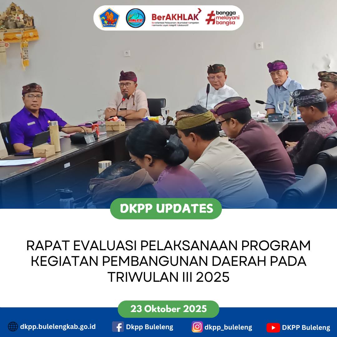 Kamis, 23 Oktober 2025 - Dinas Ketahanan Pangan dan Perikanan (DKPP) Kabupaten Buleleng yang diwakili Perencana (Dewa Gede Rahjana Suthama, S.Pi.) menghadiri Rapat Evaluasi Pelaksanaan Program Kegiatan Pembangunan Daerah pada Triwulan III Tahun 2025. Rapat dipimpin langsung oleh Bupati Buleleng dr. I Nyoman Sutjidra, Sp.OG bersama Wakil Bupati Buleleng Gede Supriatna SH., dan didampingi Sekretaris Daerah. Pada kesempatannya, Bupati Buleleng menekankan perihal efektivitas pelaksanaan program kerja di setiap instansi.