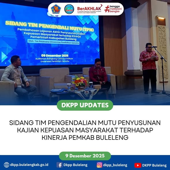 Dinas Ketahanan Pangan dan Perikanan (DKPP) Kabupaten Buleleng menghadiri Sidang Tim Pengendali Mutu (TPM) Pembahasan Laporan Akhir Penyusunan Kajian Kepuasan Masyarakat terhadap Kinerja Pemerintah Kabupaten Buleleng, bertempat di Auditorium Balingkang Confucius Institute, Universitas Pendidikan Ganesha. Selasa (9/12)