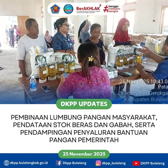 Dinas Ketahanan Pangan dan Perikanan (DKPP) Kabupaten Buleleng melalui Bidang Distribusi dan Cadangan Pangan melakukan pembinaan di LPM Subak Gede Gerokgak, dengan tujuan untuk melakukan pengecekan bantuan pemerintah berupa barang dan uang serta melakukan pendataan stok beras/gabah yang tersedia di masing-masing LPM. Kegiatan dilanjutkan dengan melakukan pendampingan penyaluran bantuan pangan beras dan minyak goreng di Desa Patas, Kecamatan Gerokgak.
