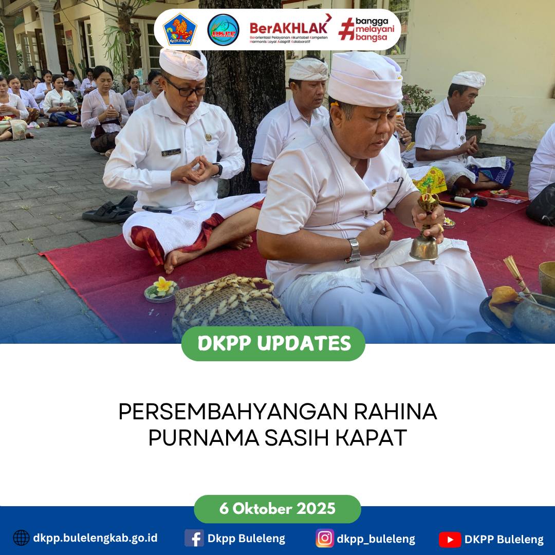 Persembahyangan bersama jajaran Dinas Ketahanan Pangan dan Perikanan (DKPP) Kabupaten Buleleng dalam rangka Rahina Purnamaning Sasih Kapat, yang jatuh pada Soma, 6 Oktober 2025. Pada Kesempatan ini, Kepala DKPP Buleleng I Gede Putra Aryana, S.Sos., MAP. menyampaikan Darma Wacana mengenai implementasi Tri Hita Karana dalam kehidupan sehari - hari.