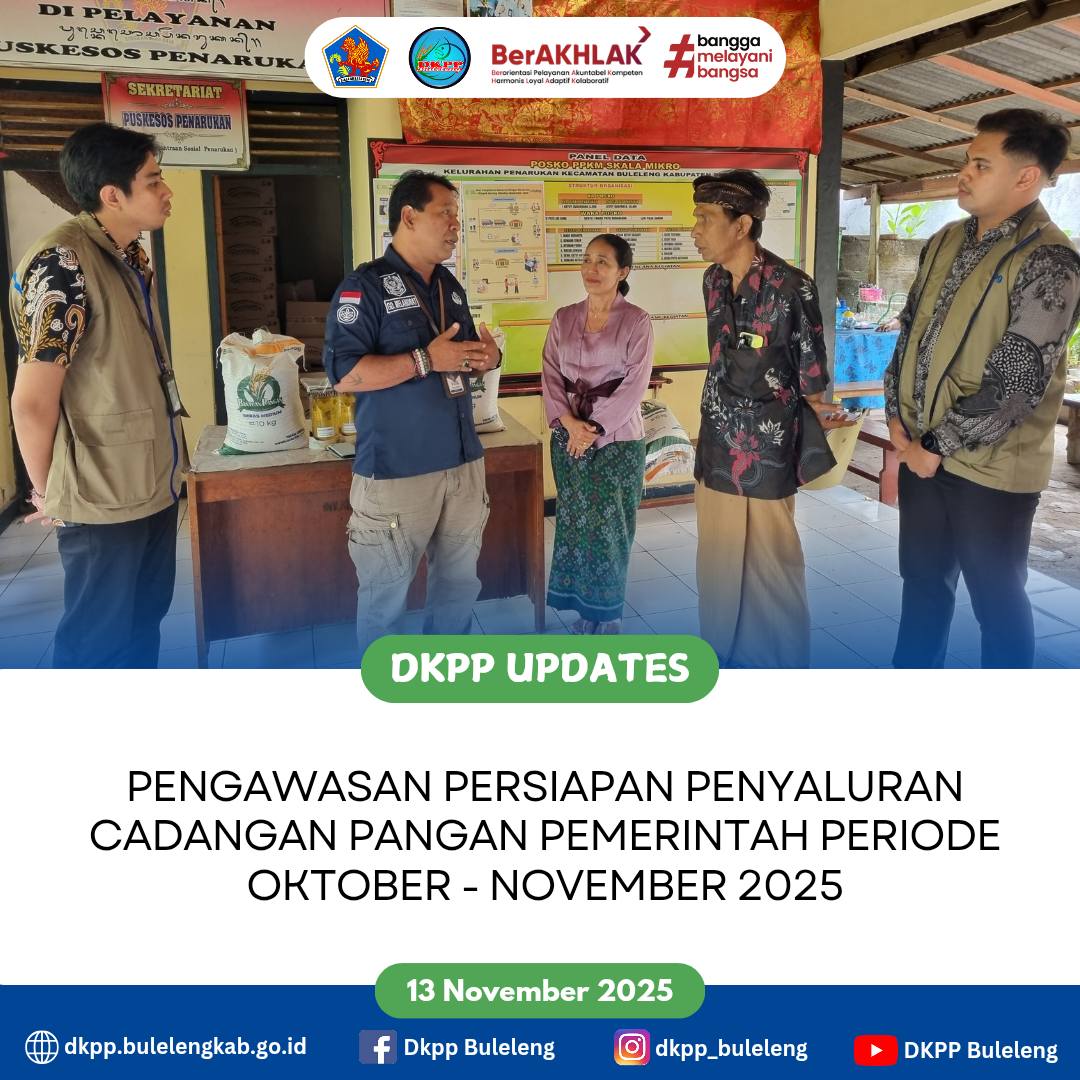 Kamis, 13 November 2025 - Plt. Kepala Dinas Ketahanan Pangan dan Perikanan Kabupaten Buleleng Gede Melandrat, SP bersama jajaran dan Tim Perum. BULOG melakukan pengawasan persiapan Penyaluran Cadangan Pangan Pemerintah dari Bapanas melalui Perum. BULOG di Kantor Lurah Banyuning dan Kantor Lurah Penarukan, Kecamatan Buleleng, dalam rangka Pemberian Bantuan Pangan berupa Beras & Minyak periode Oktober - November 2025 kepada masyarakat penerima, sekaligus dalam menyambut Hari Raya Galungan dan Kuningan.