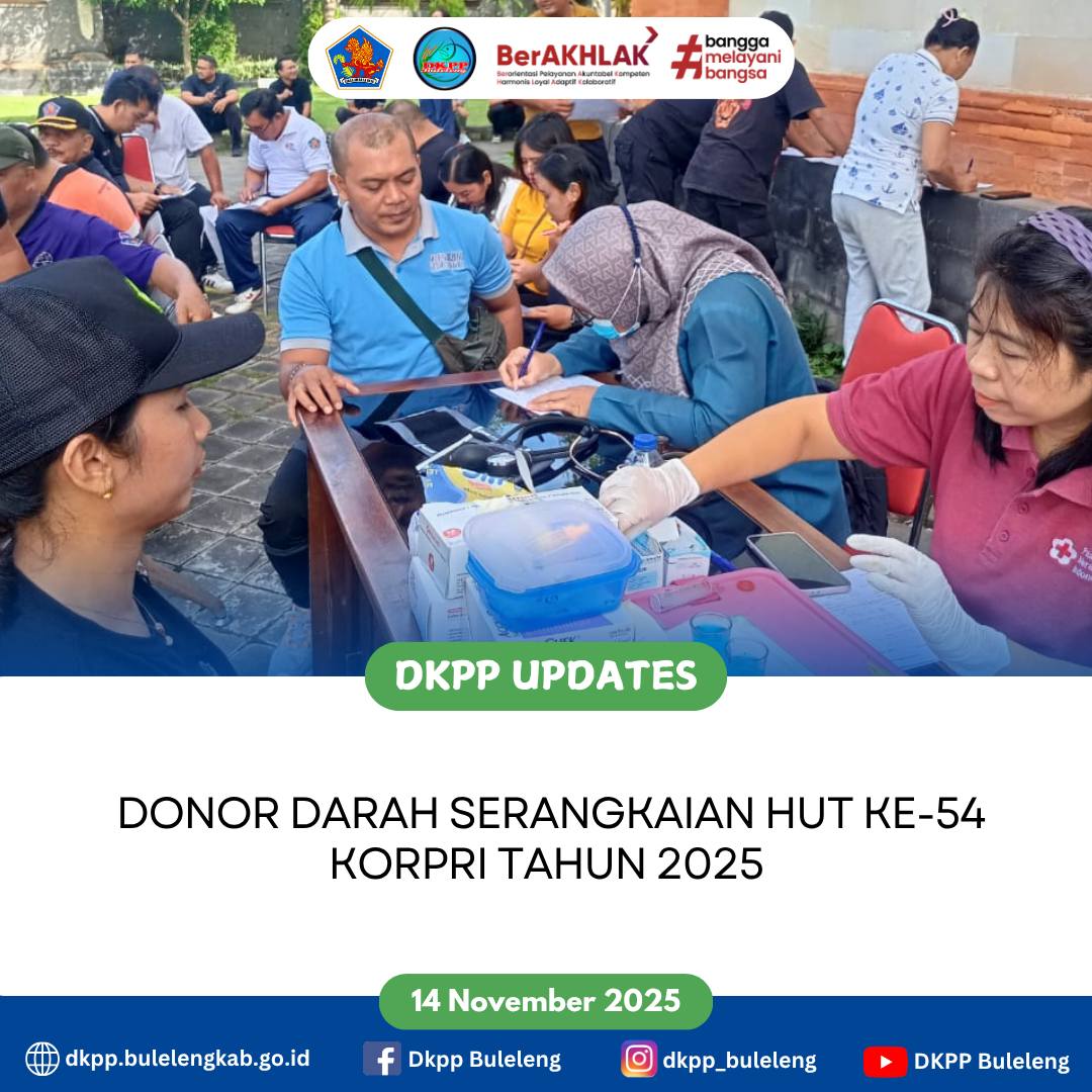 Jumat, 14 November 2025 - Dinas Ketahanan Pangan dan Perikanan (DKPP) Kabupaten Buleleng mengikuti kegiatan donor darah serangkaian HUT ke - 54 KORPRI Tahun 2025, bertempat di kantor BKPSDM Buleleng.