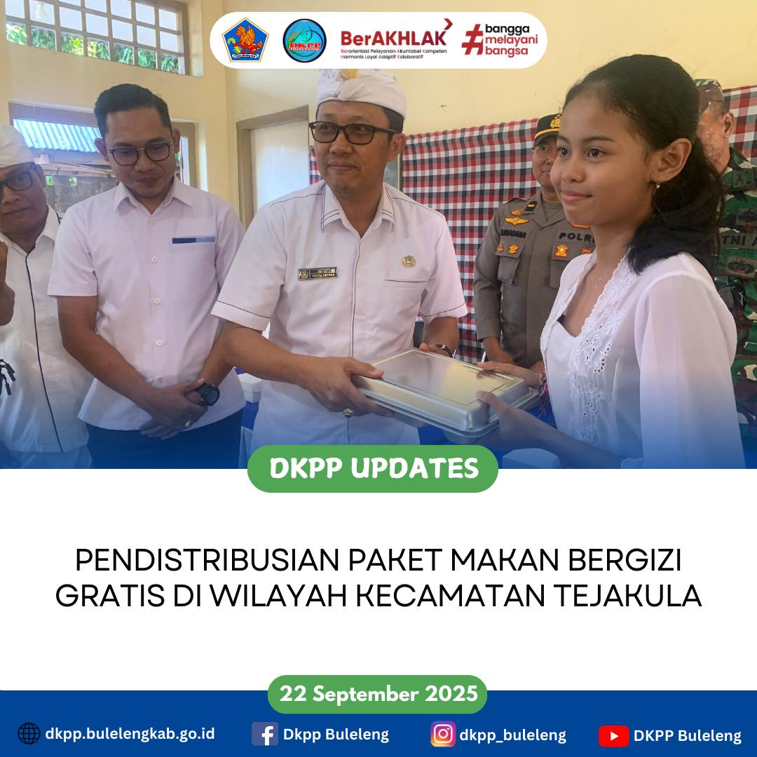 Senin, 22 September 2025 - Kepala Dinas Ketahanan Pangan dan Perikanan Kabupaten Buleleng I Gede Putra Aryana, S.Sos., MAP. menghadiri Pendistribusian Paket Makan Bergizi Gratis (MBG) pada sekolah di wilayah Kecamatan Tejakula. Penyaluran MBG ini diinisiasi oleh Badan Gizi Nasional melalui Satuan Pelayanan Pemenuhan Gizi (SPPG) guna mendukung program Presiden Republik Indonesia tentang Makan Bergizi Gratis Tahun 2025. Sampai saat ini, ada total 27.512 penerima program MBG dari 10 SPPG di seluruh Kabupaten Buleleng.