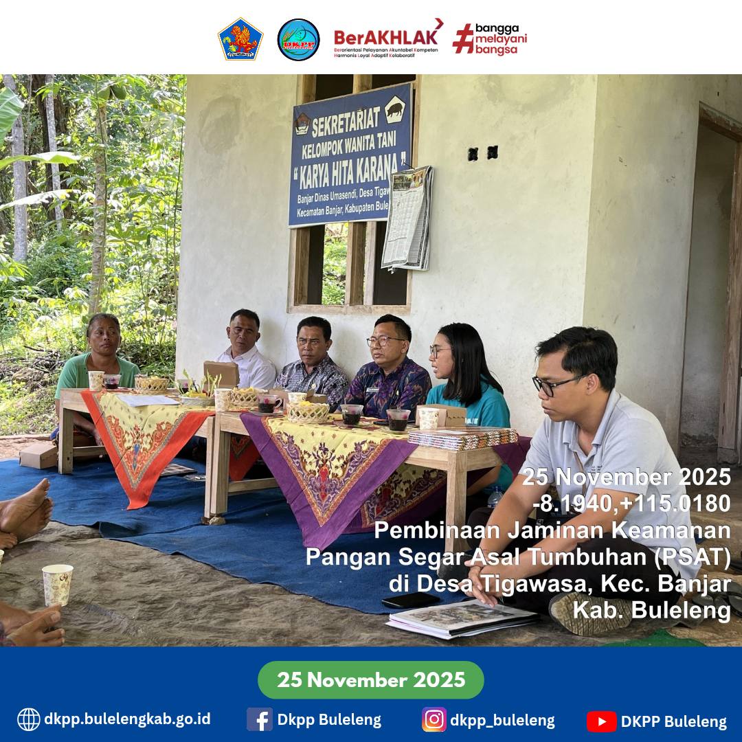 Selasa, 25 November 2025 - Dinas Ketahanan Pangan dan Perikanan (DKPP) Kabupaten Buleleng melalui Bidang Penganekaragaman Konsumsi dan Keamanan Pangan melaksanakan kegiatan pendampingan jaminan keamanan pangan segar asal tumbuhan di Kelompok Wanita Tani (KWT) Karya Hita Karana, Banjar Dinas Umasendi, Desa Tigawasa, Kecamatan Banjar. Kegiatan dihadiri oleh Analis Ketahanan Pangan Ahli Muda (Luh Pastiniasih, S.TP, M.Si) beserta staf. Kelompok memperoleh bantuan alat pengolahan berupa dehidrator, namun terkendala dalam operasional alat yang membutuhkan sumber daya listrik yang besar. Besar harapan dari kelompok untuk dapat memperoleh kesempatan pelatihan dalam proses pengolahan.
