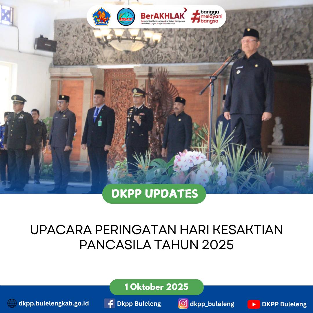 Rabu, 1 Oktober 2025 - Kepala Dinas Ketahanan Pangan dan Perikanan Kabupaten Buleleng I Gede Putra Aryana, S.Sos., MAP. bersama jajaran mengikuti Upacara Peringatan Hari Kesaktian Pancasila Tahun 2025 yang bertemakan ”Pancasila Perekat Bangsa Menuju Indonesia Raya”.