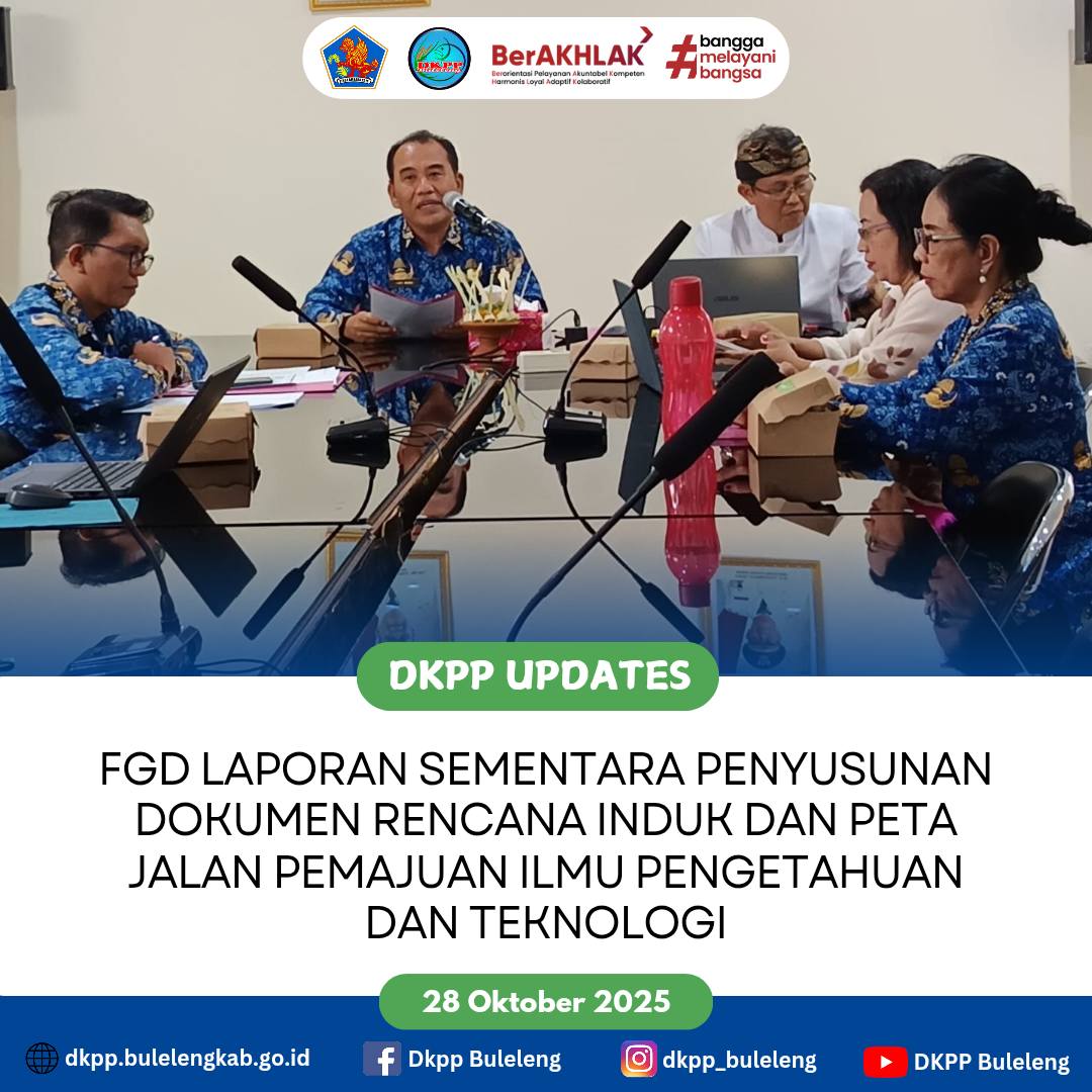 Selasa, 28 Oktober 2025 - Dinas Ketahanan Pangan dan Perikanan (DKPP) Kabupaten Buleleng yang diwakili Perencana menghadiri Focus Group Discussion (FGD) Laporan Sementara Penyusunan Dokumen Rencana Induk dan Peta Jalan Pemajuan Ilmu Pengetahuan dan Teknologi Kabupaten Buleleng Sebagai Turunan Rencana Pembangunan Jangka Menengah Daerah (RPJMD), bertempat di Ruang Rapat Brida Buleleng.