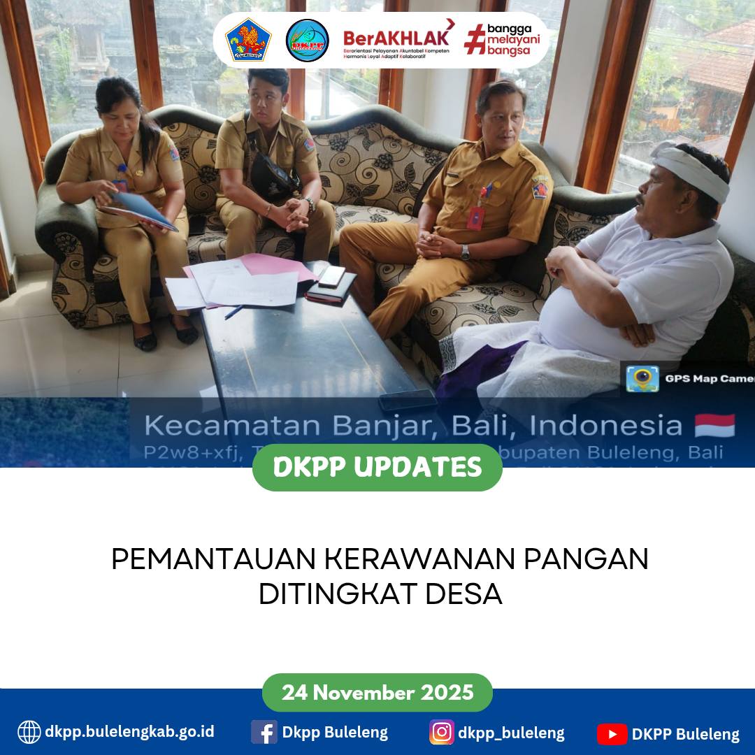 Dinas Ketahanan Pangan dan Perikanan (DKPP) Kabupaten Buleleng melalui Bidang Ketersediaan dan Kerawanan Pangan melakukan Pemantauan Kerawanan Pangan di Desa Tirtasari dan Desa Gesing Kecamatan Banjar, adapun sasaran kegiatan ini adalah mendapatkan informasi data potensi desa dan bentuk kegiatan Desa khususnya yang berkaitan dengan pemanfaatan Dana Ketahanan Pangan 20% yang dikelola BUMDES. (24/11)