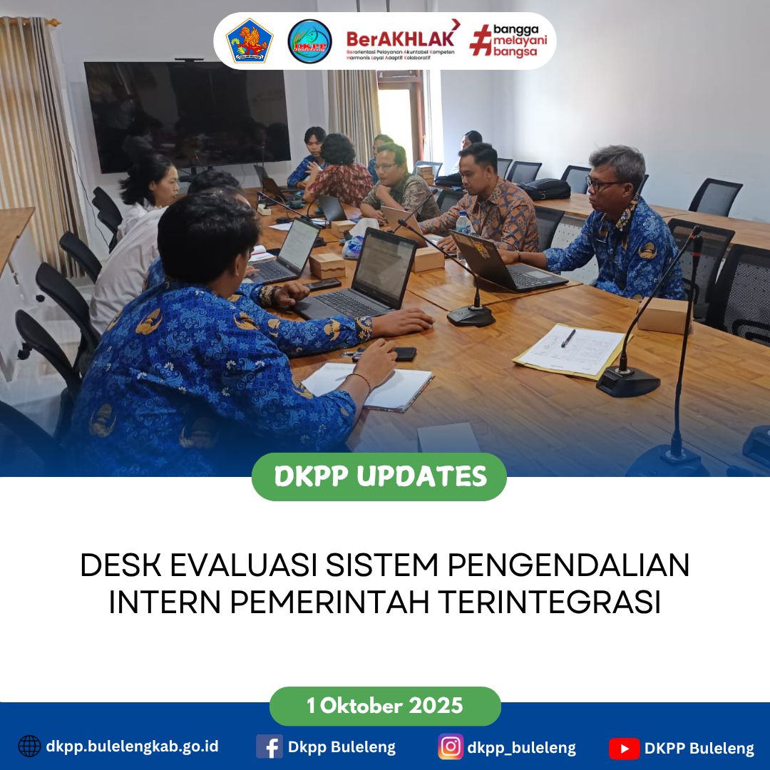 Rabu, 1 Oktober 2025 - Dinas Ketahanan Pangan dan Perikanan (DKPP) Kabupaten Buleleng menghadiri Desk Evaluasi Sistem Pengendalian Intern Pemerintah Terintegrasi (SPIPT) bersama Tim Inspektorat Daerah Kab. Buleleng dan Badan Pengawasan Keuangan dan Pembangunan (BPKP) Wilayah Provinsi Bali.