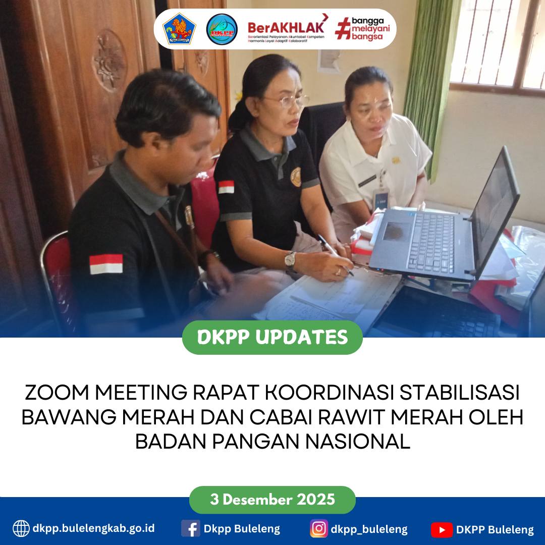 Dinas Ketahanan Pangan dan Perikanan (DKPP) Kabupaten Buleleng mengikuti Zoom Meeting terkait Rapat Koordinasi Stabilisasi Bawang Merah dan Cabai Rawit Merah yang dipimpin Bapak Maino Dwi Hartono, S.TP., MP., selaku Direktur Stabilisasi dan Pasokan Harga Pangan dan Pak Freedy dari BAPANAS. Rabu (3/12)