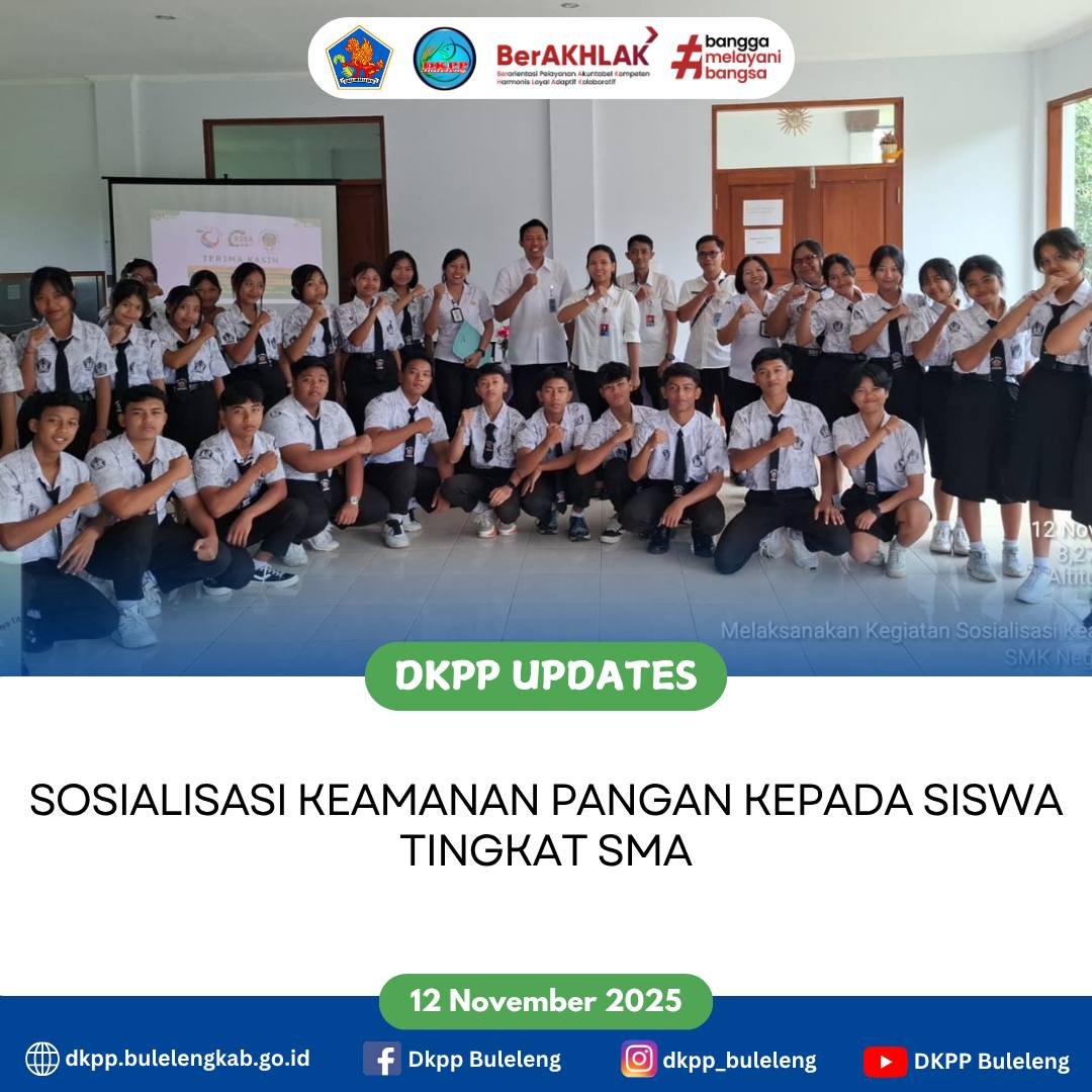 Rabu, 12 November 2025 - Dinas Ketahanan Pangan dan Perikanan (DKPP) Kabupaten Buleleng melalui Bidang Penganekaragaman Konsumsi dan Keamanan Pangan melaksanakan Sosialisasi Keamanan Pangan di SMK Negeri 1 Busungbiu. Kegiatan menghadirkan 30 orang siswa kelas 11 jurusan tata boga.